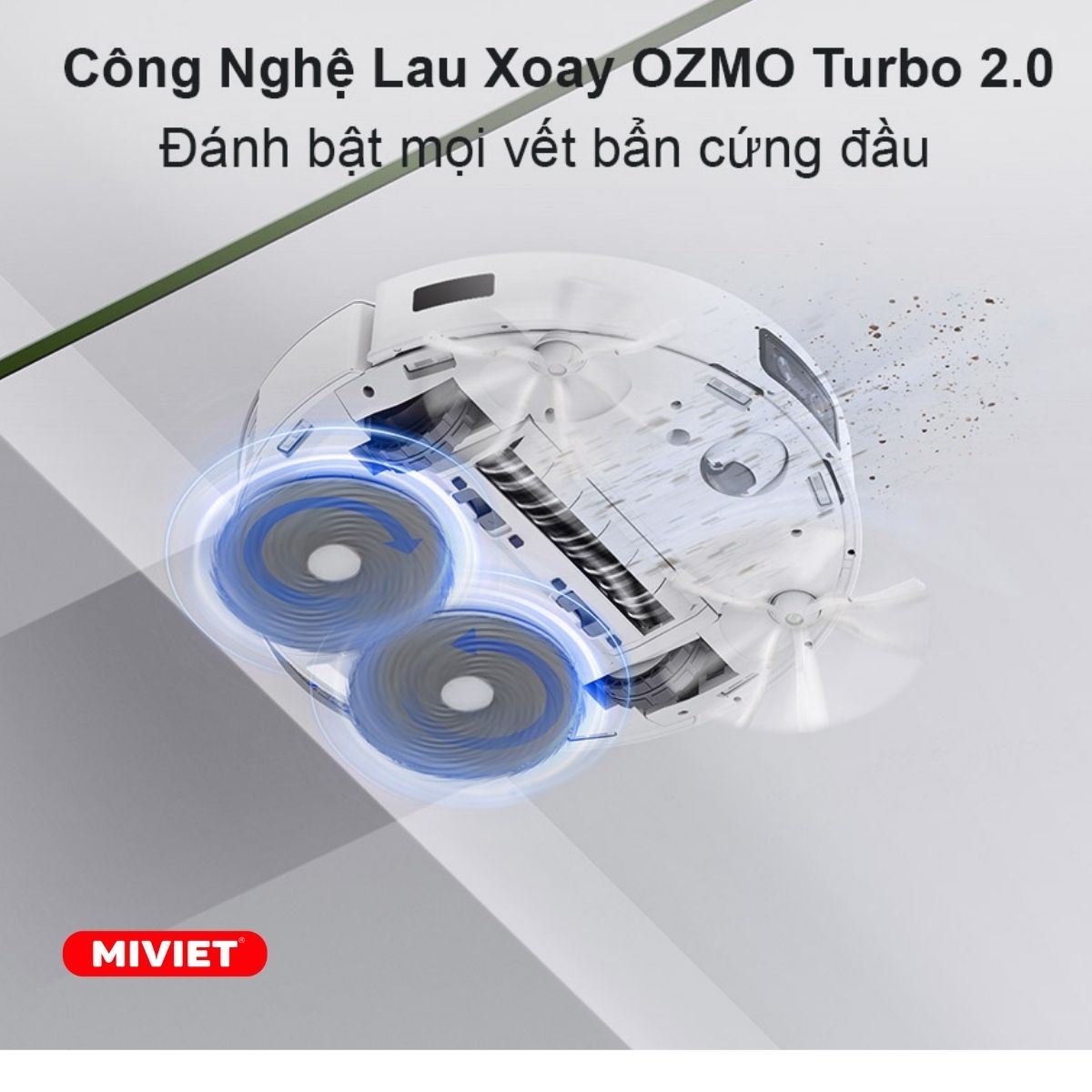 Công nghệ lau xoáy Ozmo Turbo sử dụng hai bàn xoay ngược chiều nhau kết hợp với khăn lau microfiber bền bỉ, tạo nên hiệu quả lau nhà cao gấp 4 lần so với các công nghệ lau trước đó. Với khả năng làm sạch tận gốc, robot hút bụi lau nhà giúp loại bỏ các vết bẩn và bụi bẩn trên sàn nhà, để lại không gian sạch sẽ và thoáng mát.