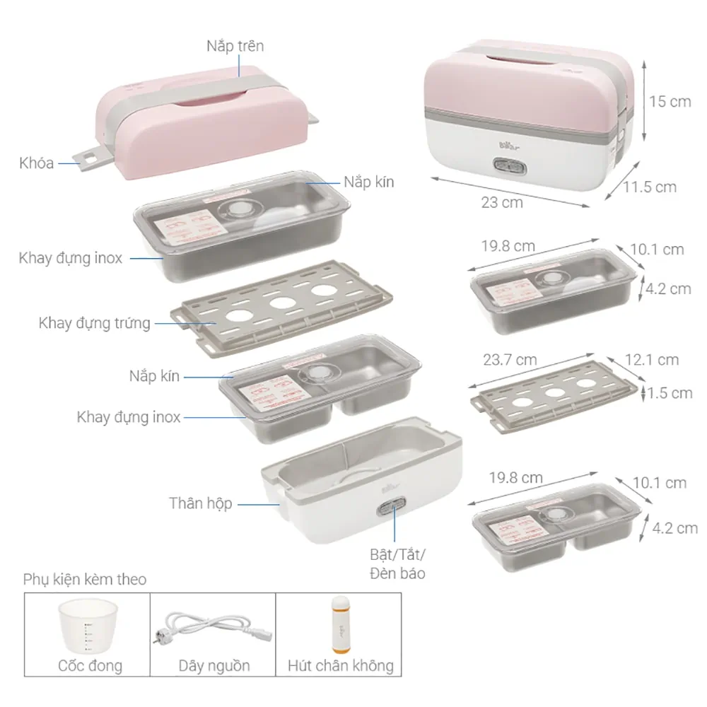 Bên trong, hãng đã trang bị 2 khay đựng chia hộp cơm thành 3 ngăn, mỗi khay sẽ đi kèm một nắp dậy đi có nút hút chân không để bảo quản thức ăn. Khay ở giữa cũng là khay ngăn 2 tầng của hộp người dùng có thể sử dụng để luộc trứng, hấp bánh…(Dụng cụ hút chân không được tặng kèm trong bộ sản phẩm).