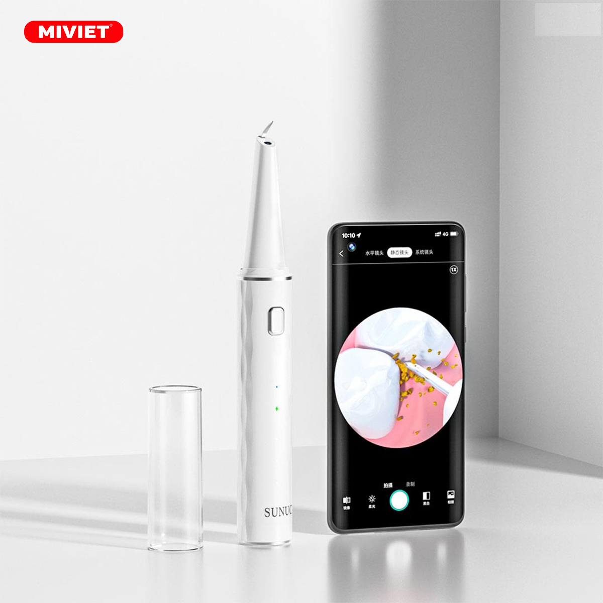 Hơn nữa, Sunuo T12 Pro được trang bị camera chụp macro với độ phân giải là 5MP và khoảng cách lấy nét cực rõ kết hợp dưới góc nhìn đến 75°. Bên cạnh đó, camera được kết nối hình ảnh với điện thoại giúp cho người dùng dễ dàng quan sát kỹ và di chuyển thao tác cầm máy đến những điểm có các bề mặt răng xấu xí khi đang lấy cao răng. Phần đầu soi còn được tích hợp thiết bị cảm biến con quay hồi chuyển 4 trục, giúp cho người dùng khi quan sát trên điện thoại luôn được giữ cố định, thiết bị không xảy ra rung lắc xoay chuyển hình ảnh khi đang thao tác hoạt động mang đến độ chính xác cao từ các nơi có mảng bám không sai sót. Và đây là tính năng nổi bật được sở hữu trên chiếc máy cạo cao răng Sunuo T12 Pro làm sạch 360° không tì vết.