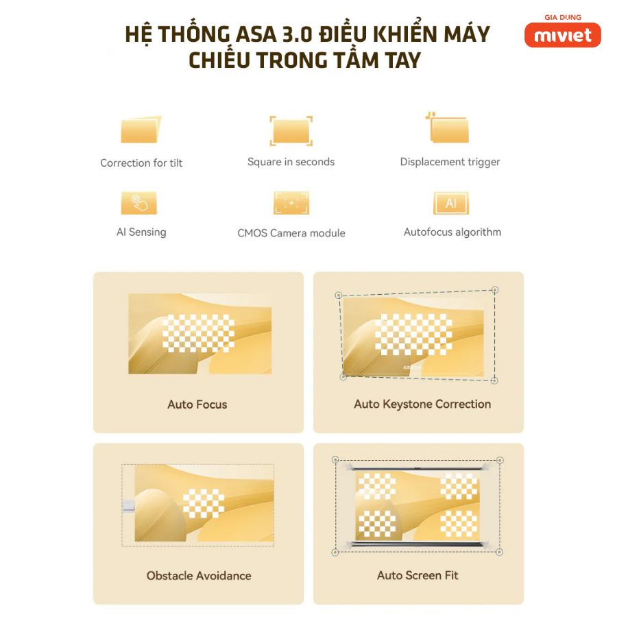 - Tự động điều chỉnh hình ảnh: Chỉnh tiêu cự, keystone, căn chỉnh màn hình và tránh chướng ngại vật hoàn toàn tự động.