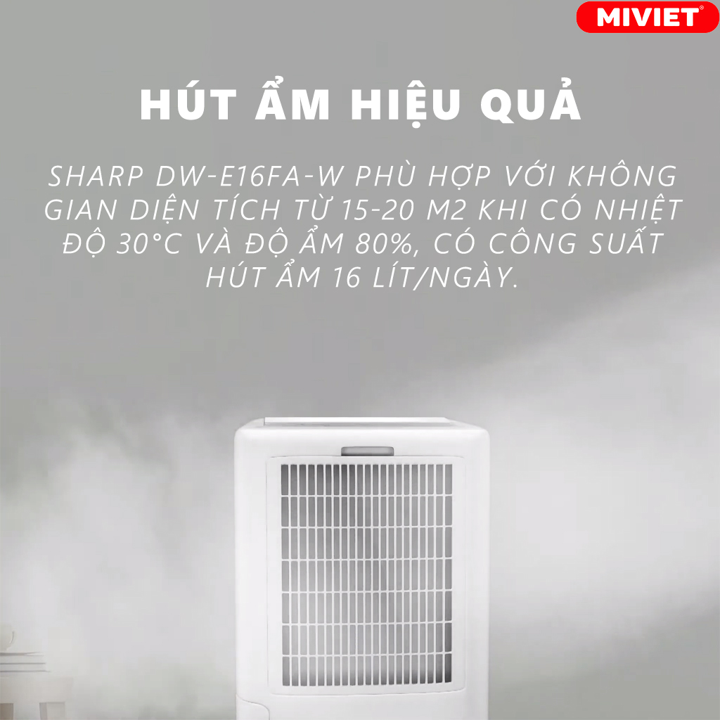 Với công suất hút ẩm 16 lít/ngày ở 30 độ C và độ ẩm 80%, Sharp DW-E16FA-W phù hợp với không gian có diện tích từ 15-20 m2.