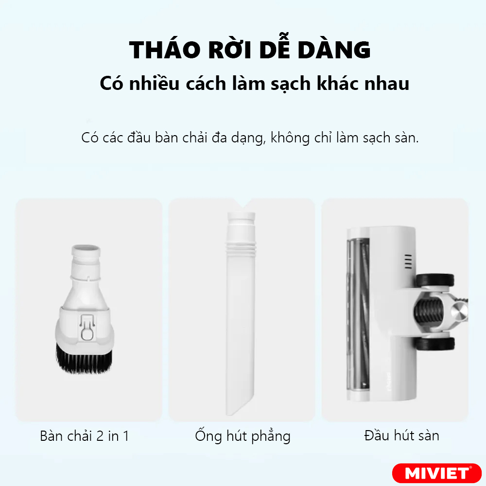 - Tích hợp nhiều chức năng hút đa năng, có thể vừa hút sàn nhà vừa hút bụi trên cao mà không cần thay đổi đầu hút.