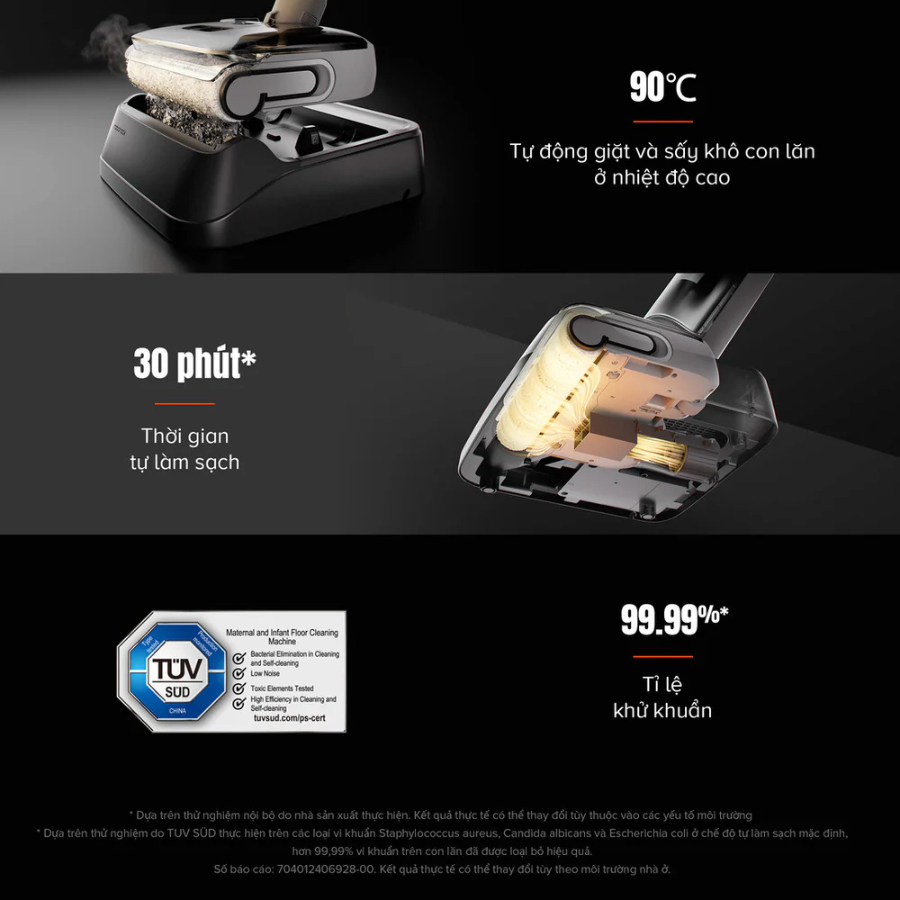 Kết hợp với thiết kế dung tích bình chứa lớn (nước sạch 870ml, nước bẩn 720ml), tính năng này hỗ trợ duy trì quá trình dọn dẹp liên tục mà không gián đoạn. Nhờ đó, bạn có thể yên tâm để máy làm việc, tận hưởng trải nghiệm vệ sinh tiện lợi và hiệu quả mỗi ngày.