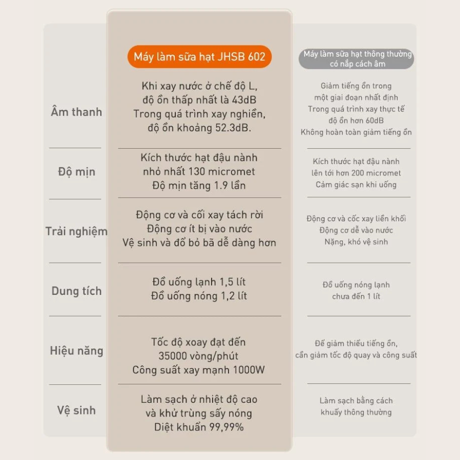 Máy làm sữa hạt Joyoung JHSB-602 được trang bị công nghệ giảm tiếng ồn 12 lớp nên hoạt động khá êm ái với độ ồn thấp chỉ 43dB. Ngoài ra hệ thống thông gió được thiết kế theo cấu trúc xoắn ốc giúp giảm thiểu tiếng ồn hiệu quả. Nhờ đó việc nấu nướng không làm ảnh hưởng đến sinh hoạt hằng ngày, mang lại trải nghiệm thoải mái, đặc biệt là khi sử dụng vào buổi sáng sớm.