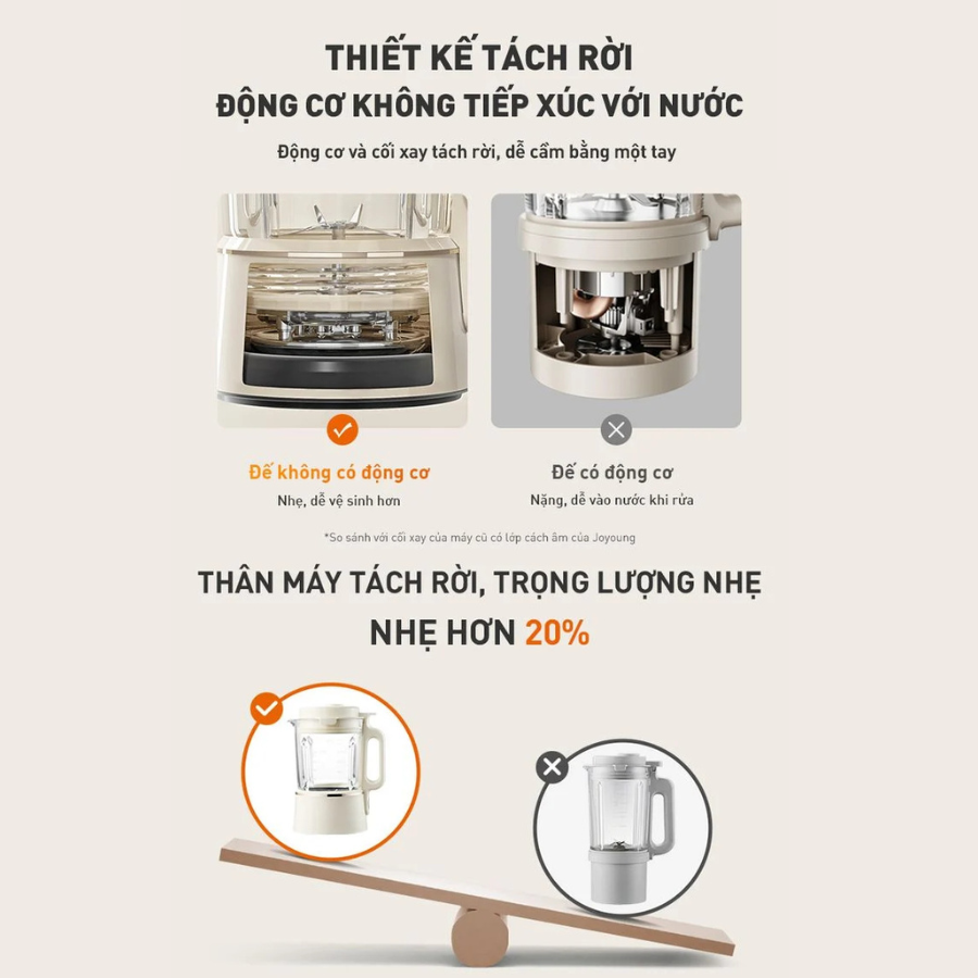 Cối xay tách rời động cơ giúp giảm thiểu trọng lượng cho thân máy đến 20%. Nhờ đó người dùng có thể dễ dàng cầm cối bằng một tay. Ưu điểm thiết kế này còn giúp quá trình vệ sinh dễ dàng hơn, không để nước làm ảnh hưởng đến động cơ điện của máy.
