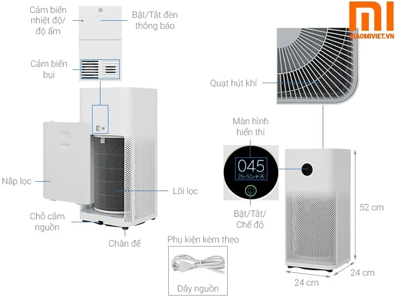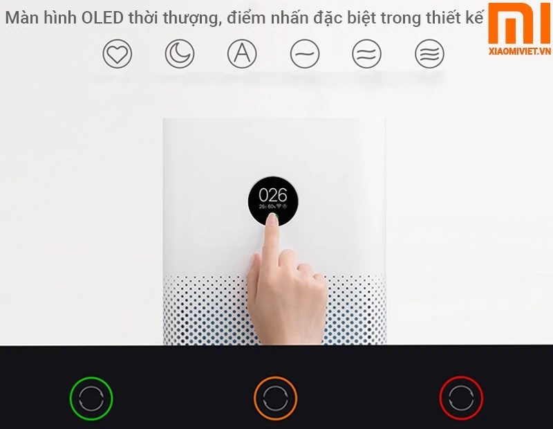 Được nâng cấp với phiên bản trước. Phần mặt trước, Xiaomi có hệ thống màn hình OLED, chỉ số PM 2.5 trạng thái Wifi, độ ẩm, chế độ quạt.