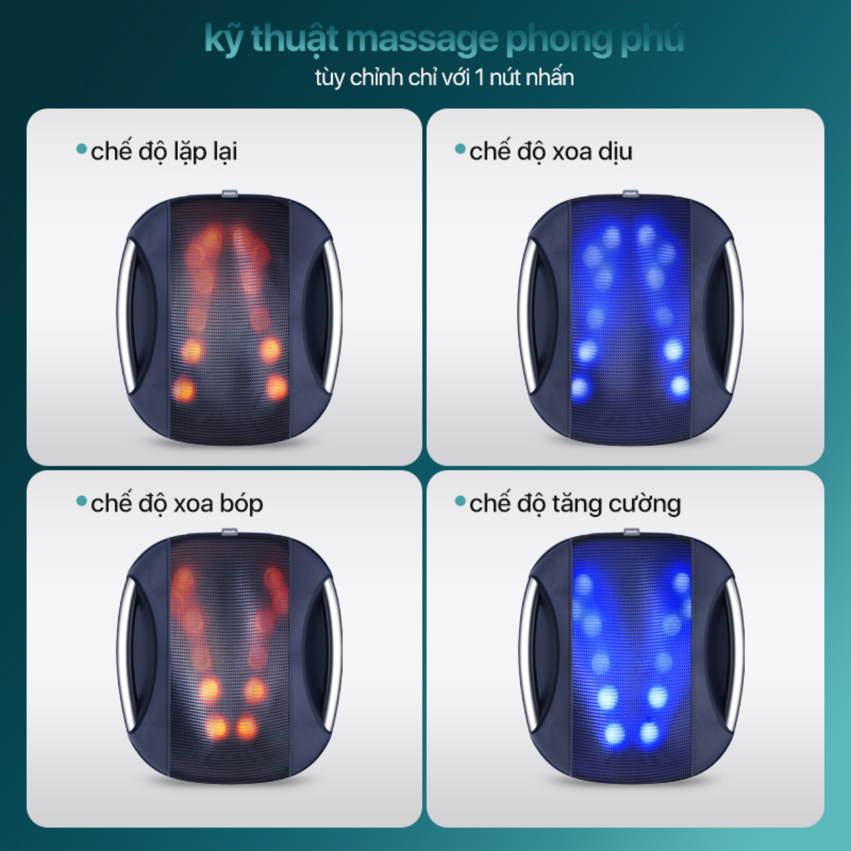 – Kỹ thuật massage phong phú với 4 chế độ tùy chỉnh trong 1 nút nhấn.
