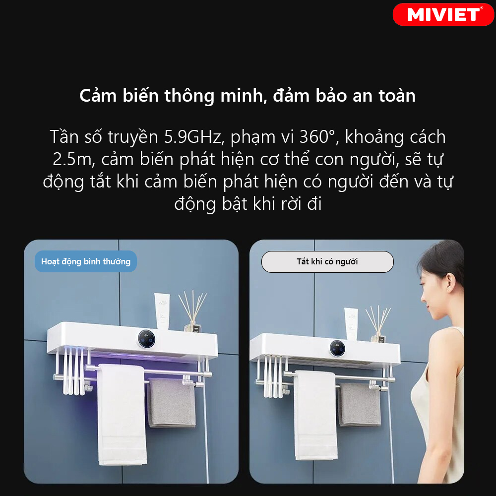 Hơn nữa, khi phát hiện có người trong phạm vi 2.5m, máy sẽ tự động tắt chế độ khử trùng UV để đảm bảo an toàn. Đây là tính năng độc đáo mà hiếm sản phẩm nào có được.