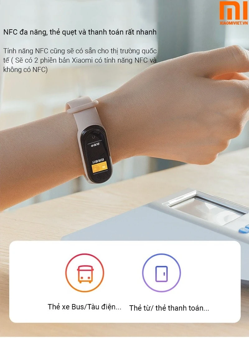 Trong các mẫu Mi Band hiện tại, tính năng NFC chỉ hoạt động trong phạm vi Trung Quốc ( tính năng thanh toán không dây NFC giúp bạn dễ dàng thanh toán trực tiếp bằng thiết bị đeo tay sức khỏe của bạn)