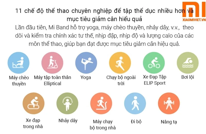 5 tính năng trên kết hợp với sáu chế độ tập thể dục đã có sẵn, như bơi lội, đi bộ, đạp xe, Mi Band 5 cung cấp tổng cộng 11 chế độ thể thao đặc biệt trên thiết bị mới này.
