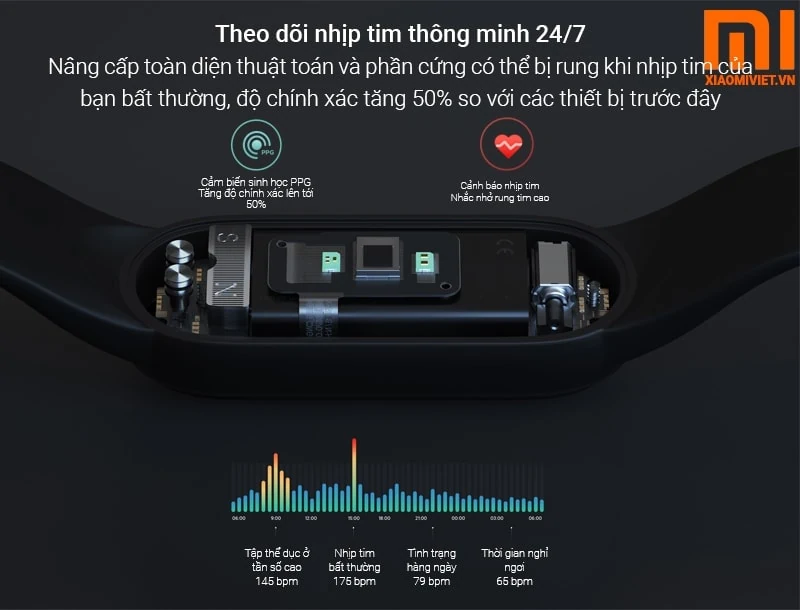 Mi Band 5 đi kèm với bộ cảm biến sinh học PPG để theo dõi nhịp tim 24 trên 7 một cách chính xác. Xiaomi tuyên bố rằng vòng đeo tay mới, có thể tăng độ chính xác của việc theo dõi nhịp tim không đều lên tới 50%. Vòng đeo tay thông minh Mi Band 5 với tính năng theo dõi giấc ngủ cũng trở nên tốt hơn và độ chính xác gấp 40% so vo với các dòng sản phẩm trước đây. Thiết bị hoàn toàn có thể cho bạn thấy bạn đã ngủ bao nhiêu giờ mỗi đêm, ngoài giấc ngủ sâu và nhẹ.