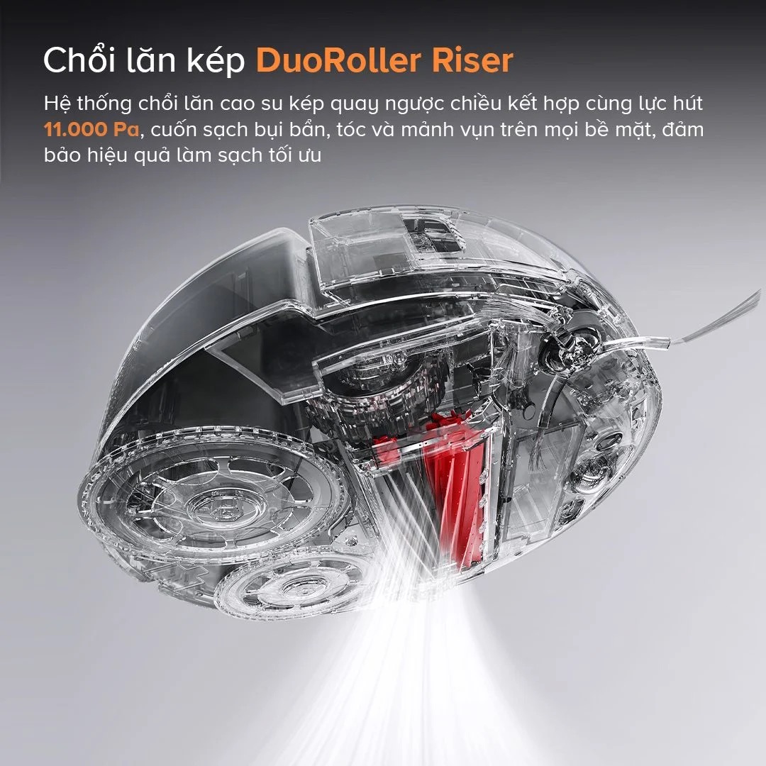 Hệ thống chổi lăn kép DuoRoller Riser quay ngược chiều kết hợp với lực hút mạnh mẽ 11.000 Pa, cuốn sạch bụi bẩn