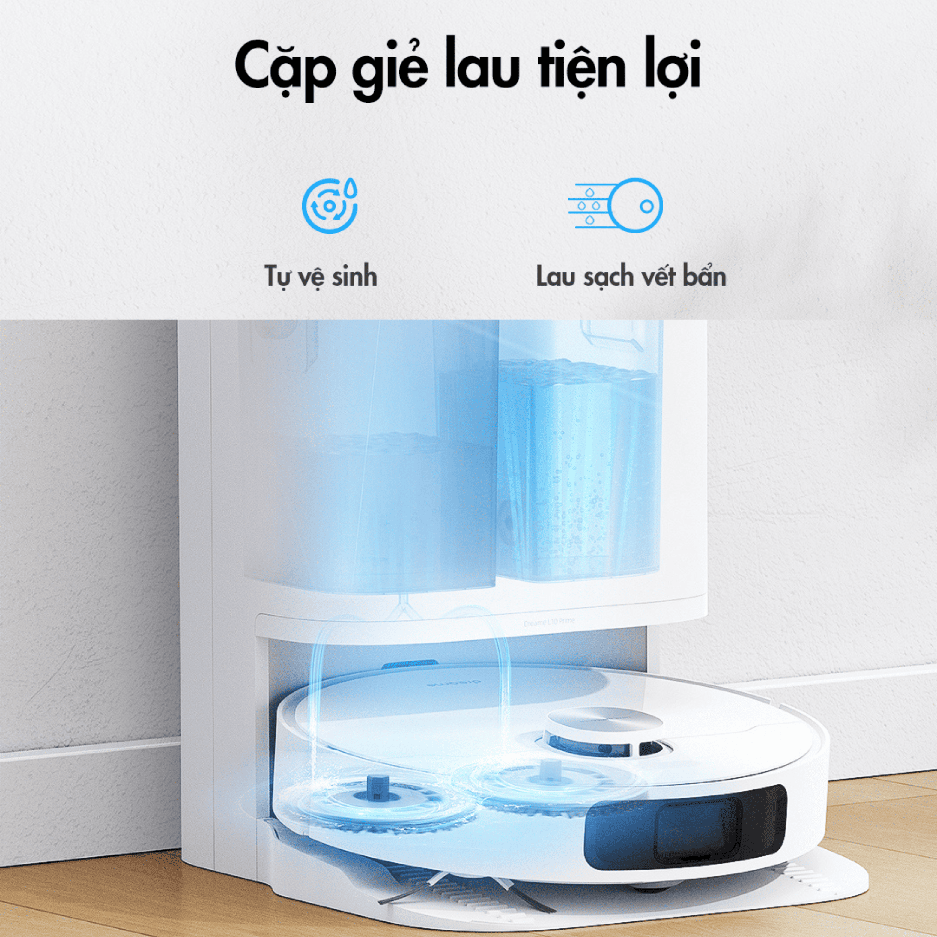 Sau khi đã hoàn tất nhiệm vụ dọn dẹp robot sẽ trở về dock sạc tiến hành giặt phần khăn lau, khăn cũng được làm khô bằng hệ thống quạt gió tích hợp bên trong dock, ngăn ngừa ẩm mốc, mùi hôi, nguy cơ tiềm ẩn cho vi khuẩn có hại phát triển.