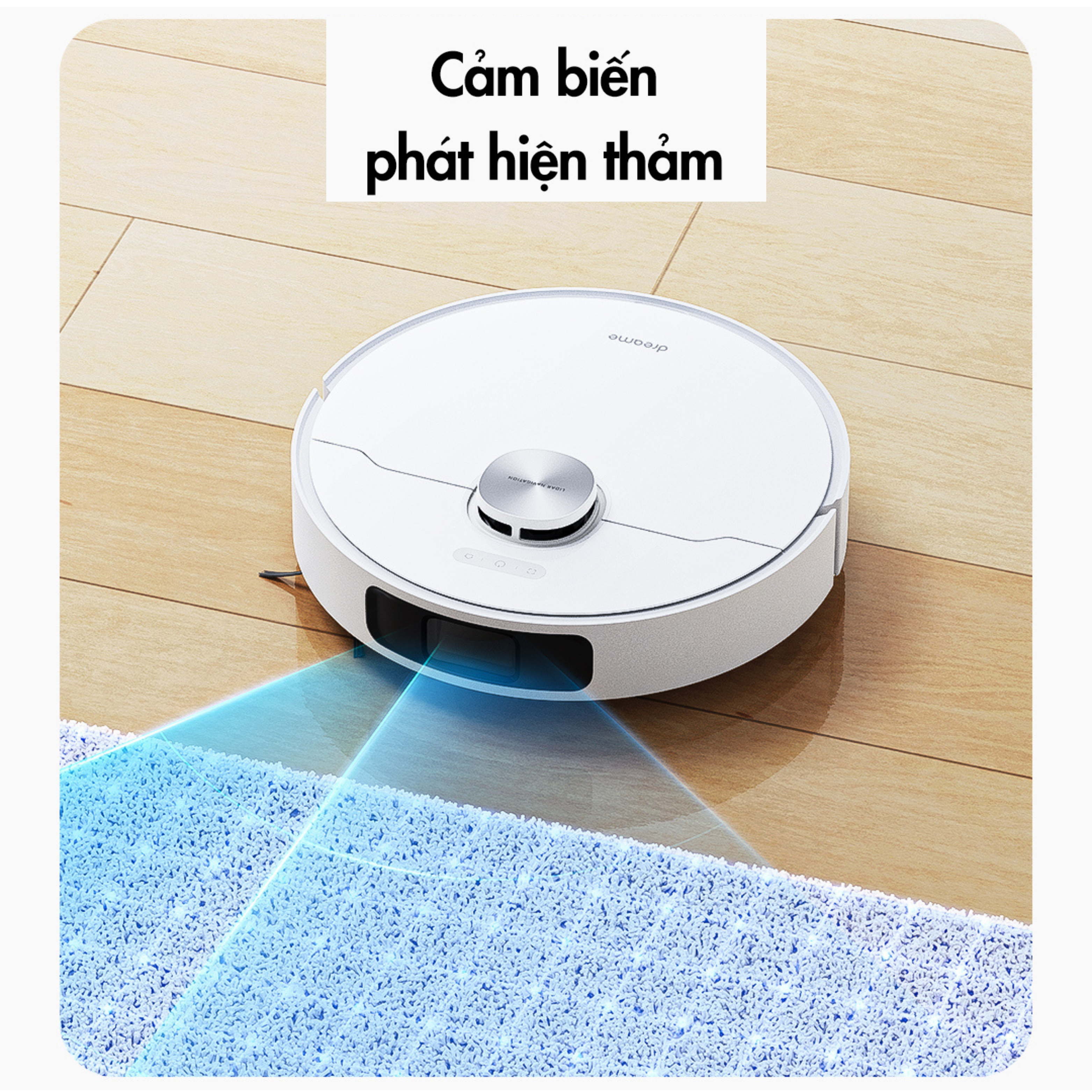 Mặt khác, Dreame L10 Prime cũng được trang bị cảm biến nhận diện thảm thông minh tự động gia tăng lực hút đến tối đa khi đi qua các khu vực có thảm, loại bỏ bụi mịn len lõi ẩn sâu trong từ sợi vải, tóc, lông thú nuôi, vụn bánh…Đồng thời, khi đi qua thảm phần khăn lau cũng sẽ được nâng lên 5mm để tránh làm ướt thảm.