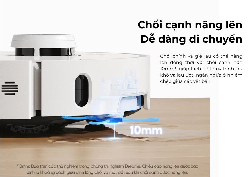- Bàn chải bên có thể nâng lên đến 10mm giúp làm sạch kỹ càng, nhất là dưới chân ghế, giường