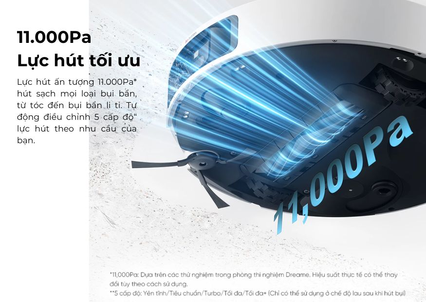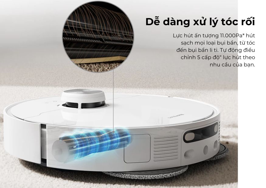 - Công suất hút 11,000 Pa giúp xử lý cả bụi bẩn lớn nhỏ, tóc và lông thú cưng một cách dễ dàng.