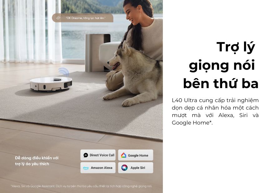 Dreame L40 Ultra hỗ trợ điều khiển bằng giọng nói, mang lại sự tiện lợi tối đa cho người dùng. Bạn có thể dễ dàng điều khiển robot qua các lệnh thoại đơn giản như “Bắt đầu làm sạch” hay “Quay trở lại dock sạc.” Ngoài ra, sản phẩm còn tương thích với các trợ lý giọng nói như Amazon Alexa, Google Assistant và Siri, cho phép điều khiển từ xa thông qua các thiết bị thông minh.