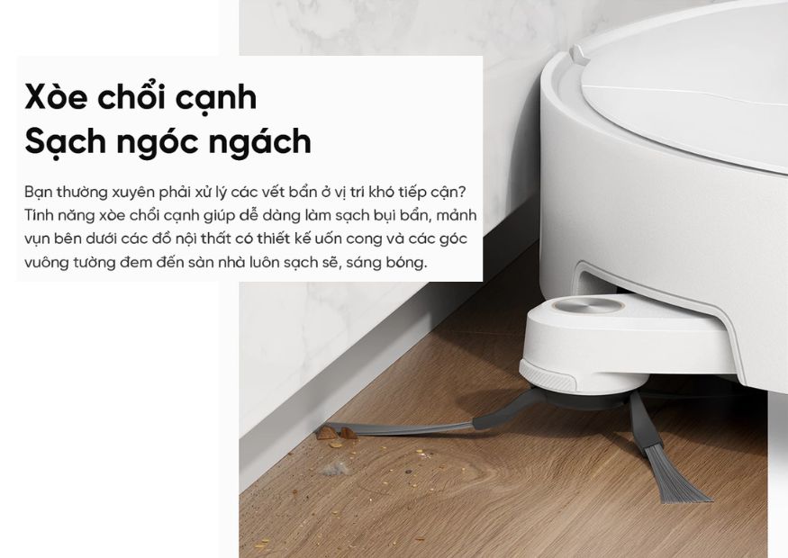 - Làm sạch triệt để góc cạnh: Nhờ hệ thống cảm biến đa hướng 360 độ, robot có khả năng tiếp cận và làm sạch các khu vực khó tiếp cận như góc tường và dưới đồ nội thất.