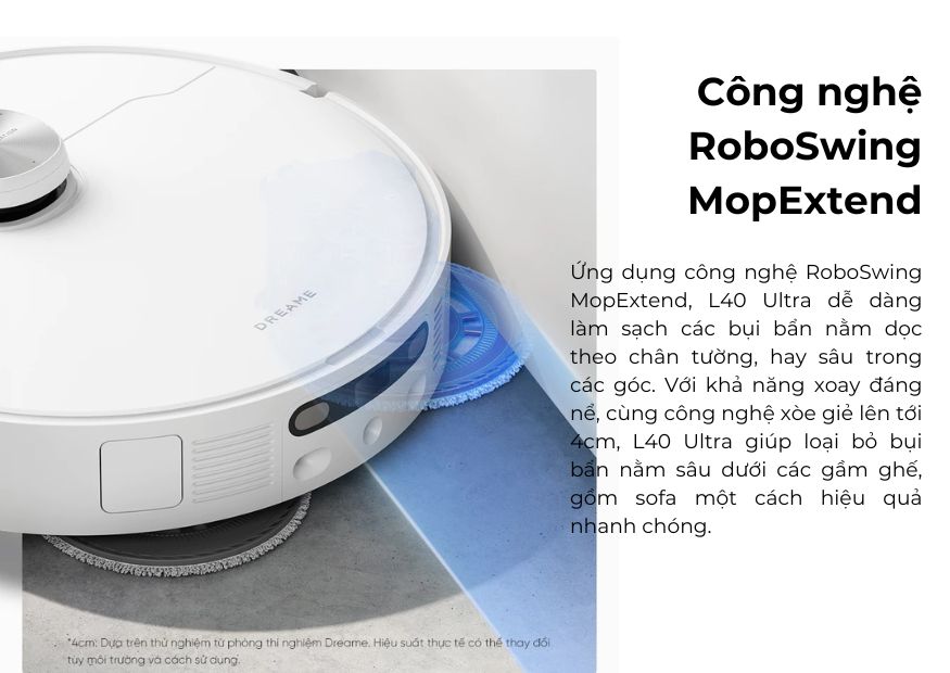 Công nghệ xòe giẻ MopExtend RoboSwing cho phép giẻ lau tự động mở rộng và linh hoạt điều chỉnh. Tính năng này giúp làm sạch triệt để các khu vực cạnh tường, dưới gầm bàn và các ngóc ngách hẹp. Dreame L40 Ultra dễ dàng xử lý những vùng mà các robot khác thường không chạm tới.
