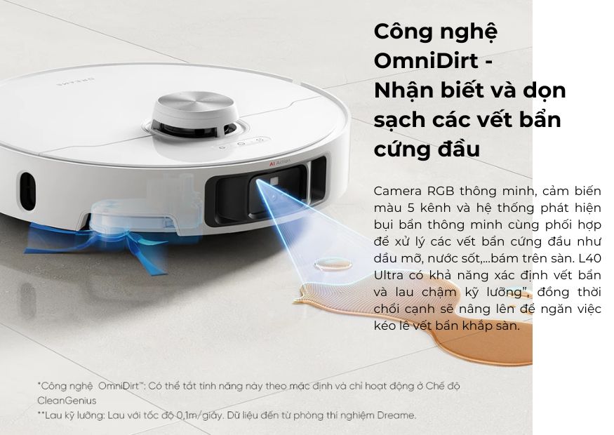 - Nhận diện vết bẩn cứng đầu: Dreame L40 Ultra có khả năng phát hiện và xử lý các vết bẩn cứng đầu, như vết cà phê hay vết bùn, bằng cách làm sạch nhiều lần trên những khu vực này.