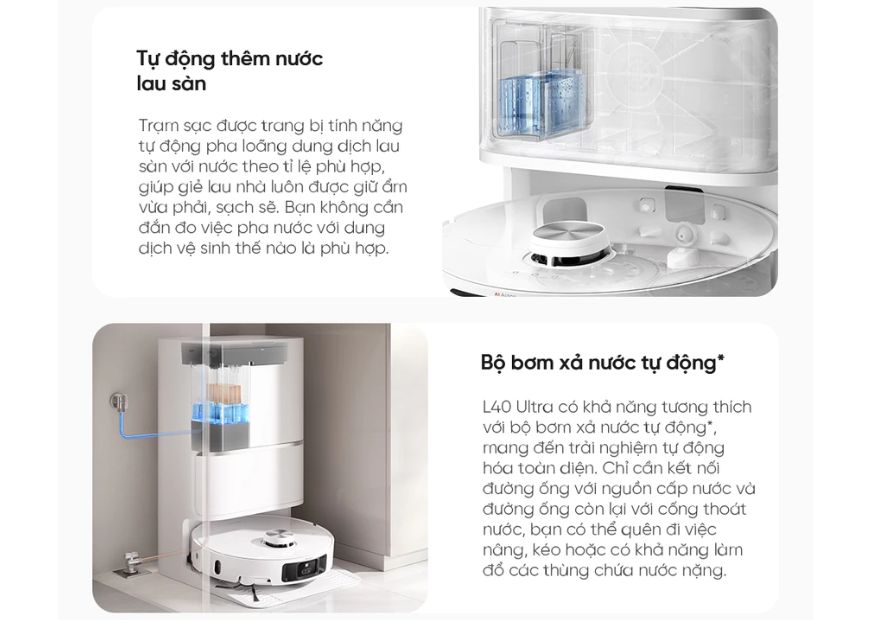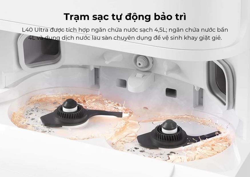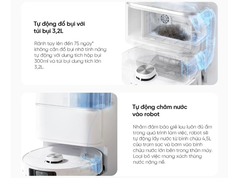 - Thùng chứa bụi 3.2L với khả năng tự đổ rác và hai bình chứa nước (4.5L cho nước sạch và 4L cho nước bẩn), giảm thiểu việc vệ sinh thủ công.