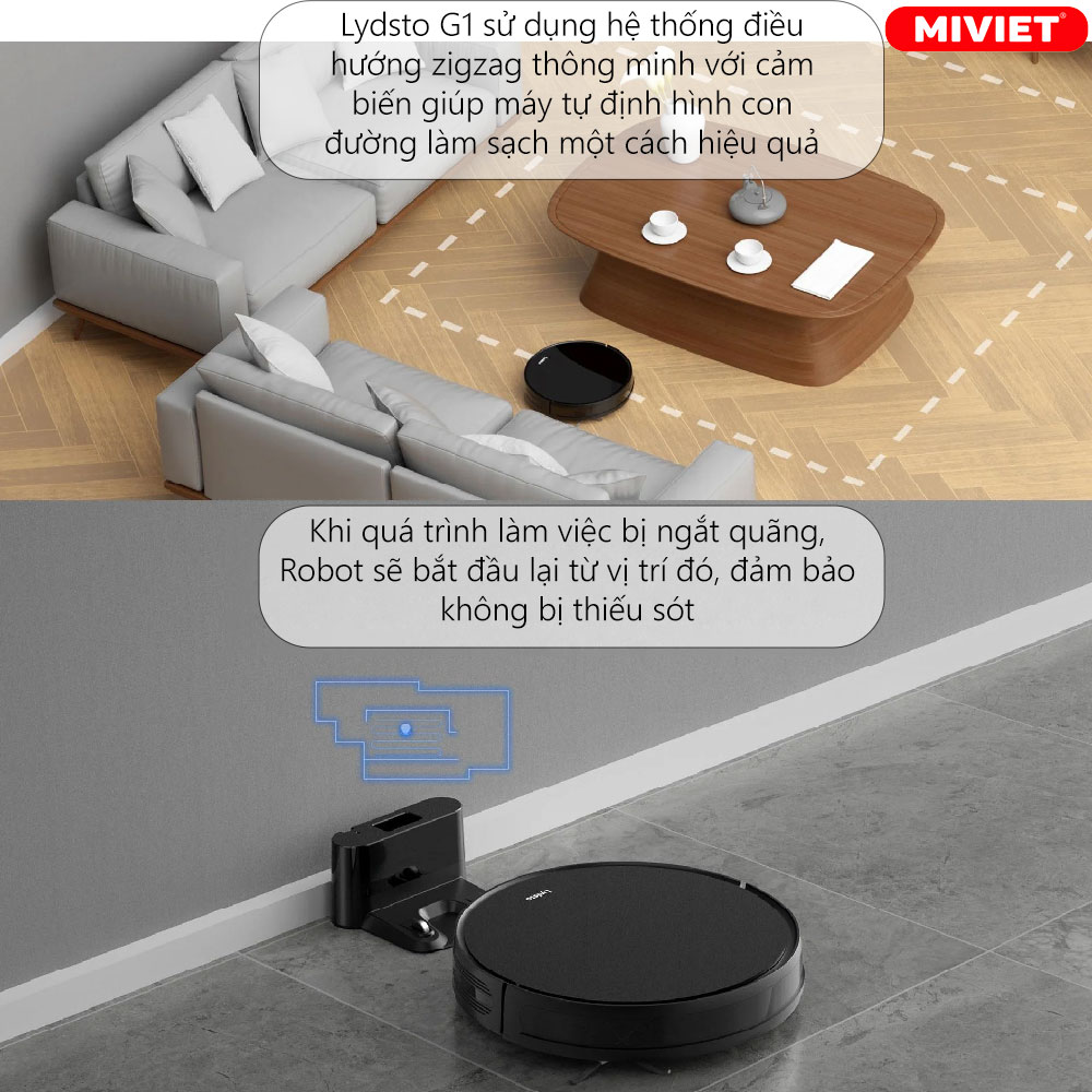 Lydsto G1 có khả năng lưu lại vị trí hoạt động trước đó, trong trường hợp bị ngắt quãng khi đang hoạt động, hệ thống thông minh sẽ tự định vị, động cơ cập nhật bản đồ động và quay lại điểm bắt đầu “Breakpoint” để tiếp tục quét, đảm bảo bản đồ ổn định mà không có va đập ngẫu nhiên và thiếu sót.