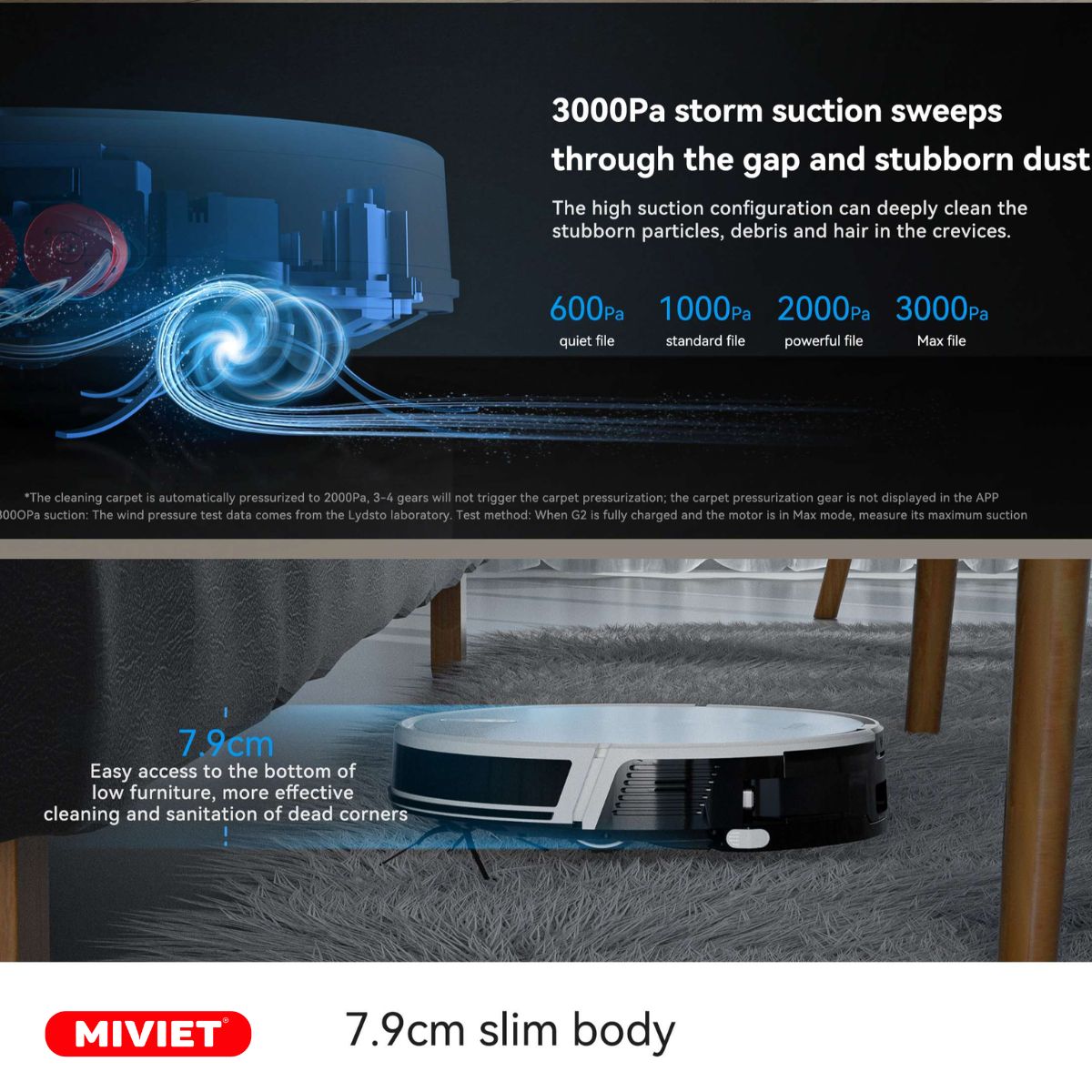 Ngoài ra, Robot Lydsto G2 được trang bị động cơ không chổi than từ Nhật Bản, có khả năng hút với công suất mạnh 3000PA và công suất hoạt động 50W. Điều này cộng với bộ lọc HEPA cải tiến có khả năng loại bỏ các hạt bụi siêu nhỏ có kích thước chỉ 0.3mm, ngăn chặn vi khuẩn và bụi bẩn nhỏ li ti thoát ra môi trường. Đây chính là một trong những chiếc máy có khả năng hút mạnh nhất trong phân khúc các dòng robot lau dọn có giá rẻ, mang lại hiệu suất cao cho việc làm sạch bụi và lau nhà.