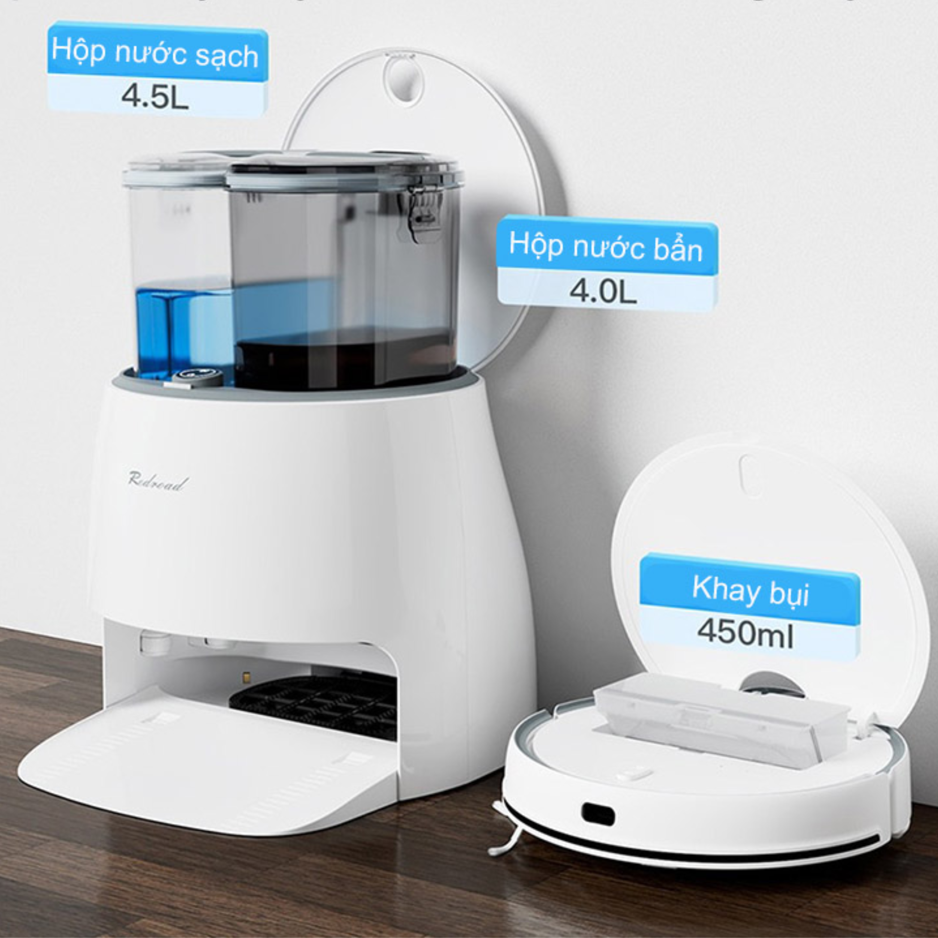 Đặc biệt hơn, trong quá trình làm sạch giẻ Redroad G10 có thêm tính năng sấy giẻ bằng khí nóng. Giẻ được sấy khô sẽ hạn chế được mùi ẩm mốc, vi khuẩn phát triển gây nên mùi hôi khó chịu ảnh hưởng đến sức khỏe. Bên cạnh đó G10 có thêm hộp chứa nước sạch và dơ lần lượt là 4.5 lít và 4 lít, bạn sẽ không cần phải thường xuyên thay nước cho Robot.