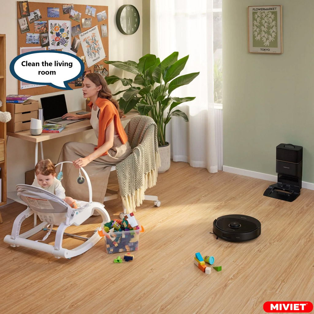 Bạn có thể điều khiển robot dọn nhà bằng lệnh giọng nói đơn giản. Chỉ cần ra lệnh, Q8 Max+ sẽ tự động bắt đầu làm sạch toàn bộ nhà hoặc tập trung vào các phòng cụ thể.