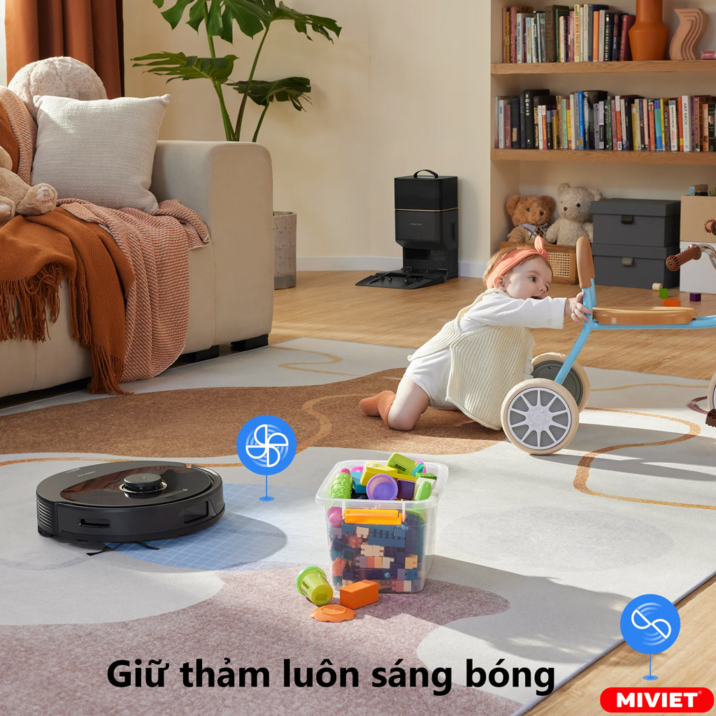 Trong lúc dọn dẹp, Q8 Max+ khi phát hiện thảm sẽ tự động tăng công suất hút lên mức tối đa để đảm bảo làm sạch sâu thảm, giữ cho thảm luôn sáng bóng.