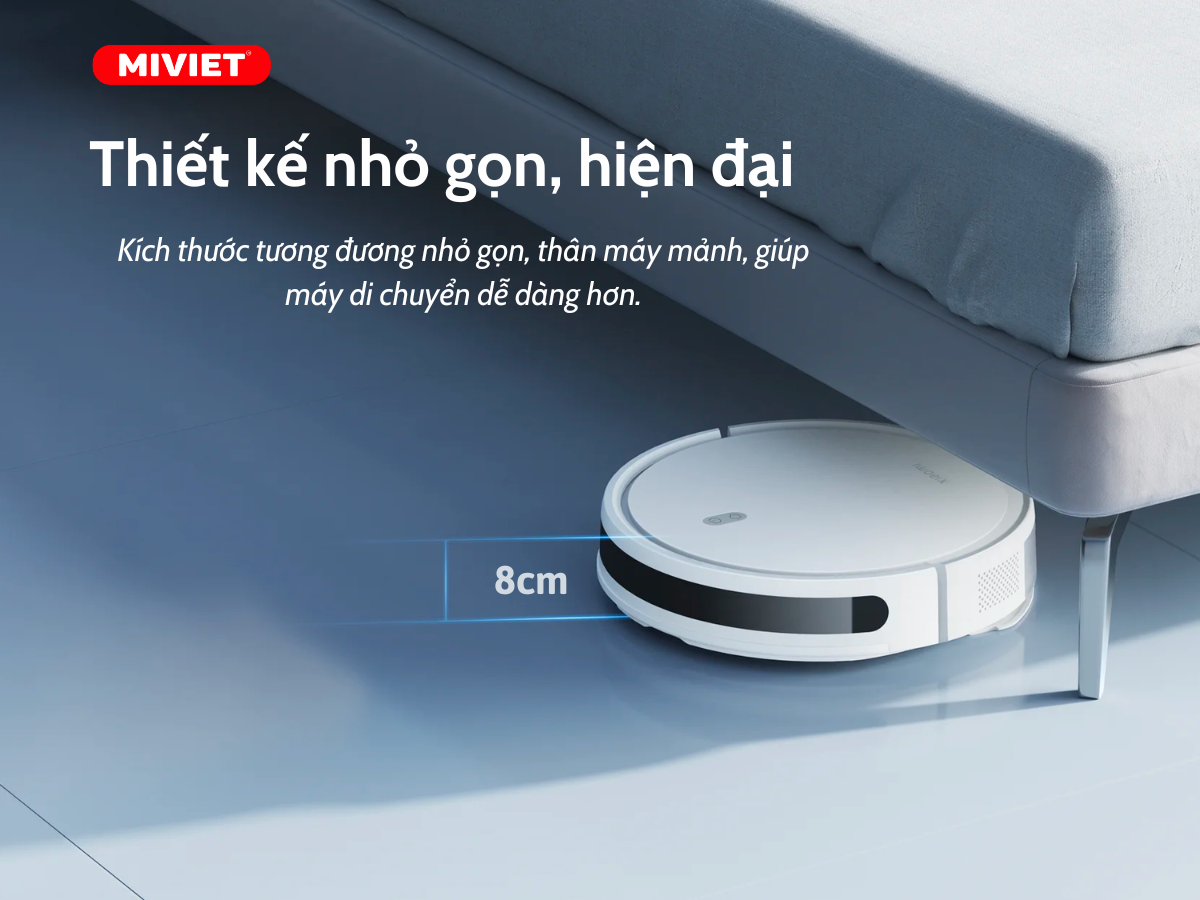 Robot hút bụi Xiaomi Vacuum E10 sở hữu cho mình kích thước tương đương nhỏ gọn, thân máy mảnh nên có thể di chuyển trong các ngóc ngách chật hẹp, và dễ dàng hoạt động tại các khu vực dưới gầm giường, tủ kính.