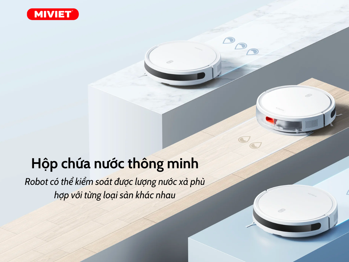 Robot Xiaomi Vacuum E10 nổi bật với hộp chứa nước thông minh, hiện đại với 3 mức lưu lượng nước. Nhờ vậy, trong quá trình vệ sinh, robot có thể kiểm soát được lượng nước xả phù hợp với từng loại sàn khác nhau. Tính năng này sẽ giúp bảo vệ sàn nhà khỏi tình trạng bị ngấm nước, ẩm mốc, đồng thời, một lượng lớn nước được tiết kiệm, giúp robot hoạt động được nhiều lần hơn, bạn sẽ không phải thay nước thường xuyên.