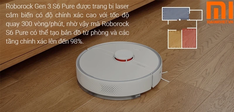 Robot lau nhà hút bụi Xiaomi Roborock Gen 3 S6 Pure được trang bị công nghệ định vị và điều hướng laser có độ chính xác cao đến từng centimet. Với tốc độ quay 300 vòng/ phút cùng với khả năng định vị điều hướng laser, robot lau nhà Roborock này có thể tạo bản đồ ngôi nhà của bạn, độ chính xác lên đến 98%.